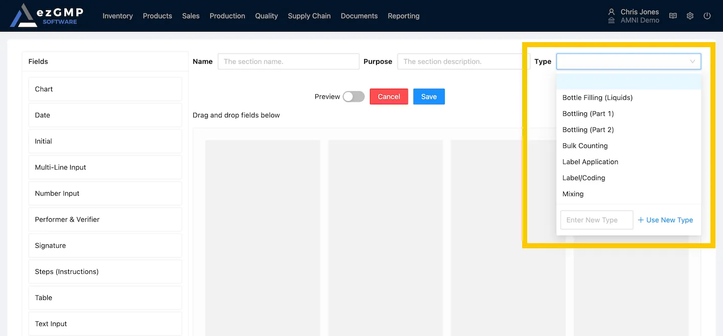 creating sections in order to make templates, you will first need to create the sections that you want to include in the template click the sections tab click the + add button in the top right corner enter the name and purpose of the section in the respective text fields at the top of the screen then, select a section type from the type dropdown list if the section type you need isn't listed, add a new type by entering a type name in the text field at the bottom of the dropdown list, then click the + use new type button begin building the section by selecting field types from the fields list on the left side drag and drop a field card in the column where you want it to appear field types chart the chart field allows you to add a chart to your documentation, which could be used for a pre run quality check log note chart is only used for encapsulation products date add a date field for any sections that need a date associated with it a user can populate the date field when documenting production by typing the date into the field manually, or by selecting a date from the calendar dropdown initial add an initial field to your section to allow users to add their initials by any item multi line input use the multi line input field to add a text field that allows for several lines of text this can be useful for notes, special instructions, or any additional long form information performer & verifier use the performer & verifier fields to add a place for users to sign off on the work they complete signature the signature field provides a place for a user to sign off on a task they complete by drawing their name in the signature box this includes a space for the user to type their name and title the date in which the document is signed will automatically populate steps (instructions) the steps (instructions) field can be used to write up a list of steps required for a particular task table add a table to a section to display information in a table format, allowing the user to quickly and easily see the data this option can be useful for listing out equipment or components, reference documents, or any other detailed list of information that would be easier to view in table format text input use the text input field to add any basic single line text field you can add a label and placeholder text for the field upload to allow users to upload documents, add an upload field to the section users can then click the upload button to attach a document from their files smart weighing the smart weighing field provides a structured layout for users to enter in ingredient and batch information, record weights and intentional overages, and sign off on the completed task weight/measure the weight/measure field can be used to add a single entry field with an indicated unit of measure sops the sops field allows you to select an sop document from the list and add it as a link in the section calculated field use the calculated field option to display an autofilled number based on the result of adding, subtracting, multiplying or dividing the amount indicated in multiple selected fields for example, include a field that automatically calculates the expected total yield of a batch by using the sum of the calculated weight/amount fields editing fields to edit any field card, click the edit icon on the card from the editing panel, you can adjust the display width of the field by device type enter a label and placeholder text to appear with the field, to help the user identify what information should be entered in the field when completing the template select the checkbox next to required to make the field required, preventing the user from bypassing the field field types may have additional options to select from in the editing panel based on the type of field you are editing make all desired selections, then click save to delete a field card, click the delete button on the card as you build the section, you can preview what it will look like once completed by clicking the preview toggle once you have added all desired fields to the section, click save the section you created will now appear in the sections list